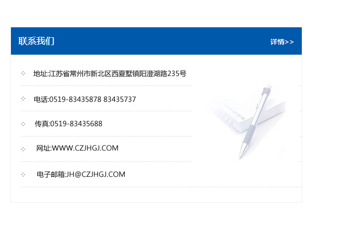 地址:常州市新北區友邦商務大廈1幢16、17層  電話:0519-85101652  傳真:0519-85112595  郵編:213022  網址:www_cz-jiayue_cn.xzpengyu.com  郵箱:xiajifengaa@163.com
